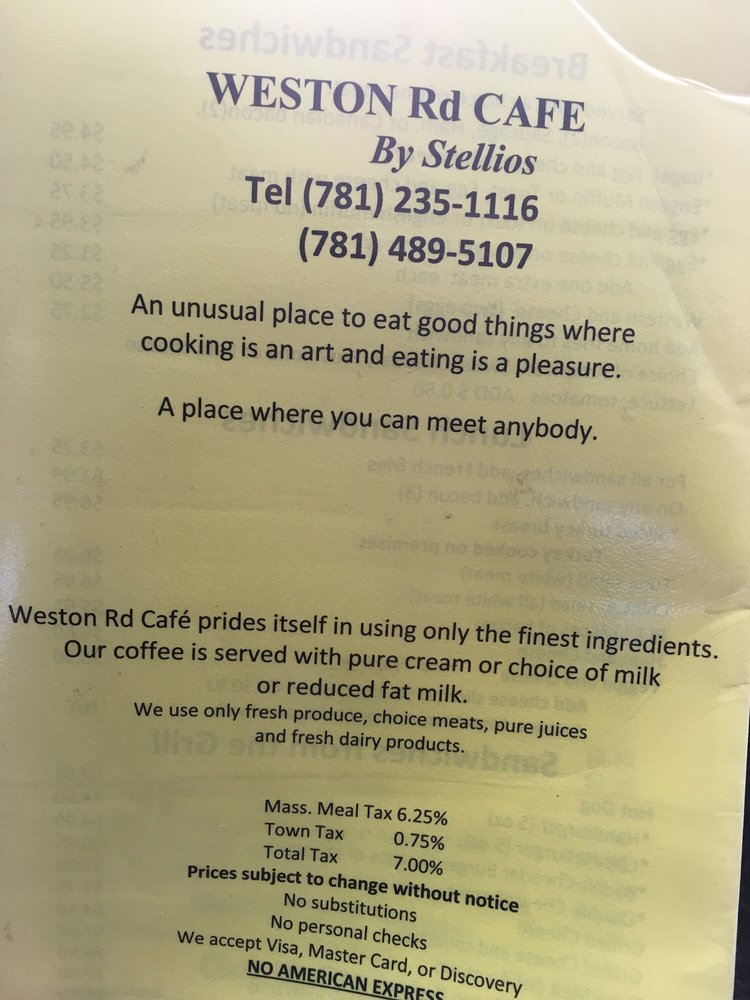 Weston Road Cafe is a cozy American cafe located on 336 Weston Rd in Wellesley, MA. Known for their delicious sandwiches, fresh salads, and hearty breakfast options, this family-owned restaurant offers a wide range of choices for every palate. From classic omelettes like the Bacon Cheddar Omelet to special dishes like the Brazilian Cheesetudo, Weston Road Cafe has something for everyone. The menu also includes tasty specials like Chicken Wings with various sides and the 1/4 lb. Super Burger Special. The casual atmosphere, friendly service, and affordable prices make it a popular spot for families and friends to enjoy a satisfying meal. With positive reviews from happy customers praising the food quality and overall experience, Weston Road Cafe is definitely a hidden gem worth exploring in the Wellesley area.